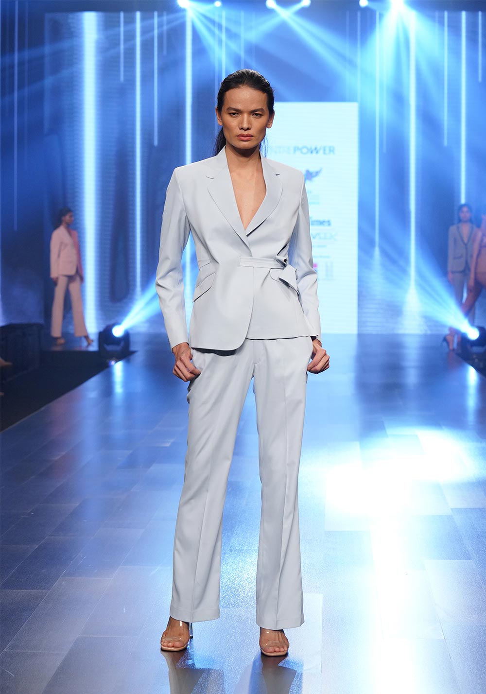 Formal tie-up business blazer with lapel collar and angular welt pockets paired with flared trouser