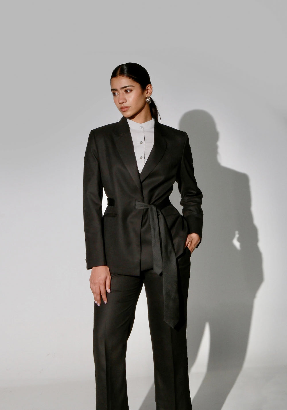 The timeless black business suit features a formal tie-up business blazer and a formal flared pair of trousers. The blazer has a lapel collar and angular welt pockets. The trouser comes with side pockets and back lip pockets.