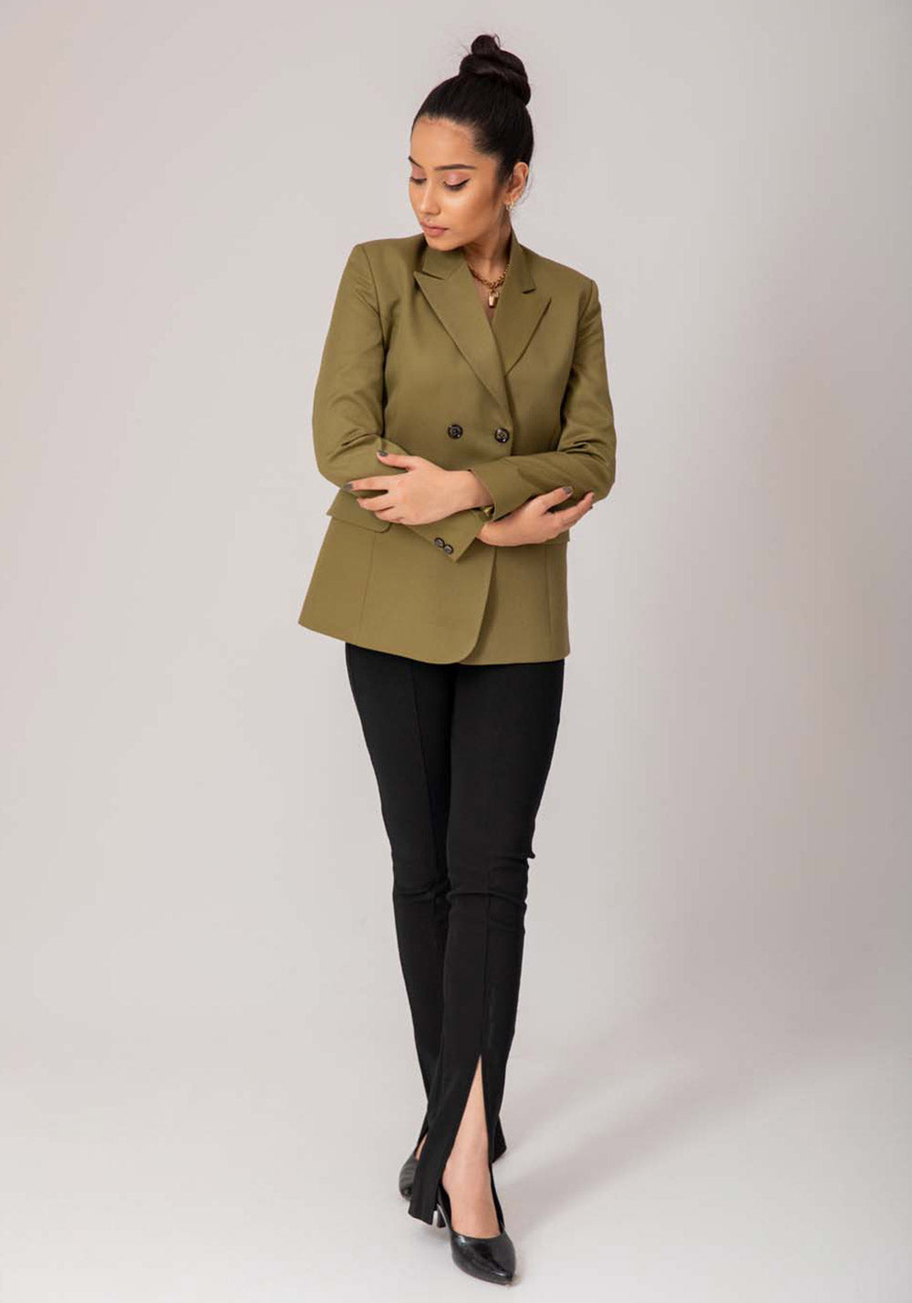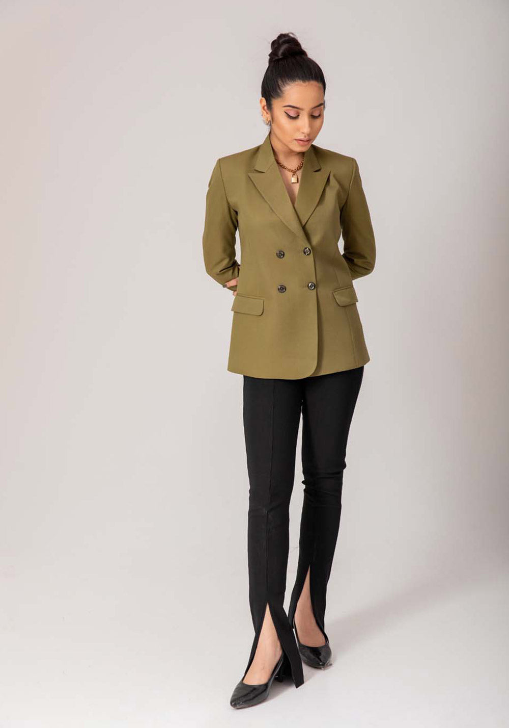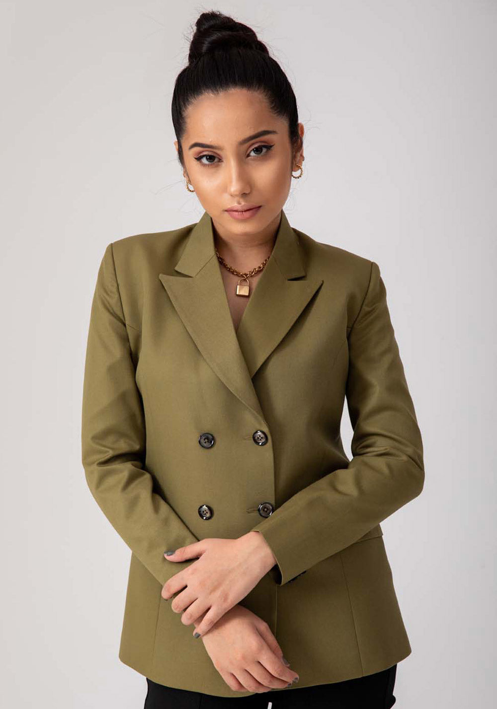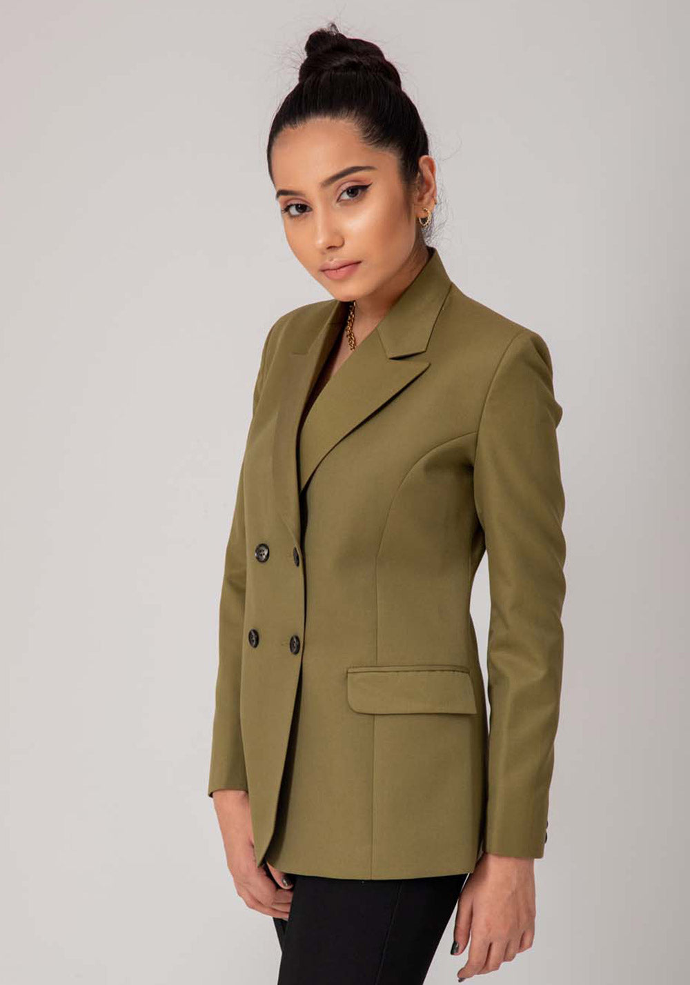 A versatile double-breasted blazer for women is intricately detailed with a notch collar and lip pocket with a flap.