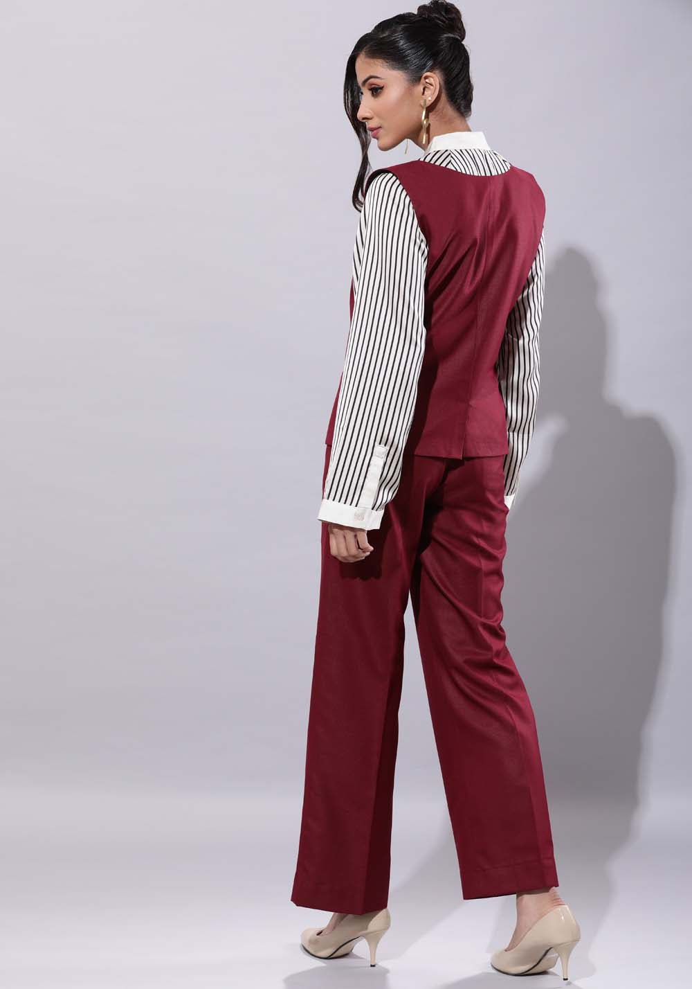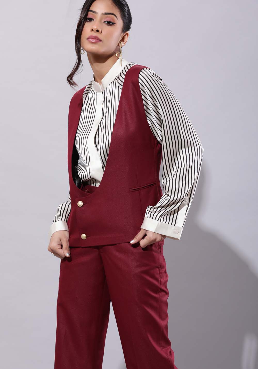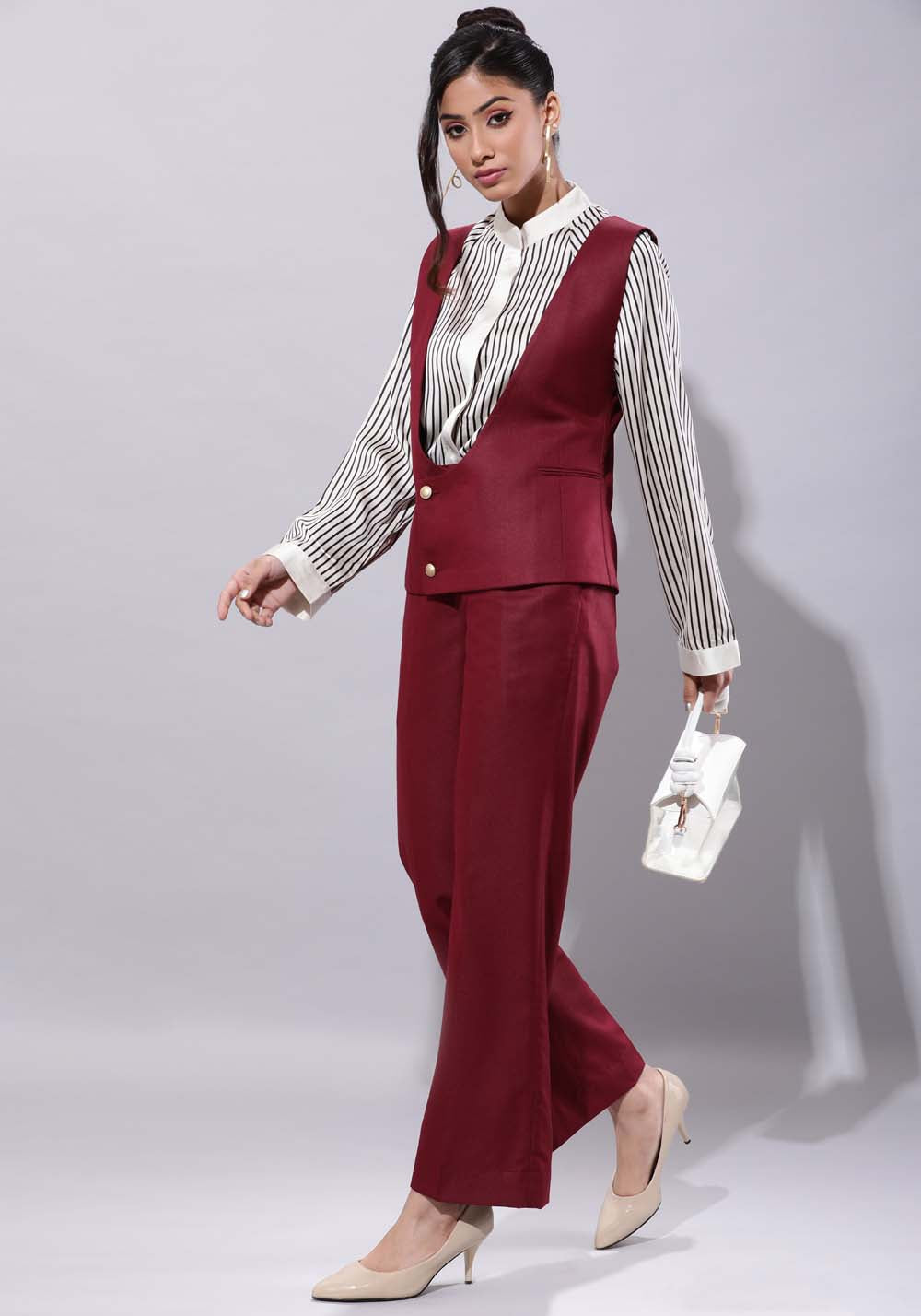 Deep Neck Waistcoat With Culottes Set- Maroon