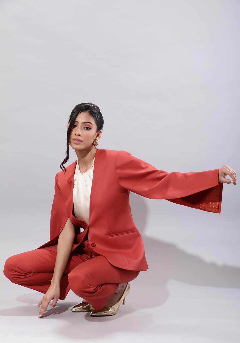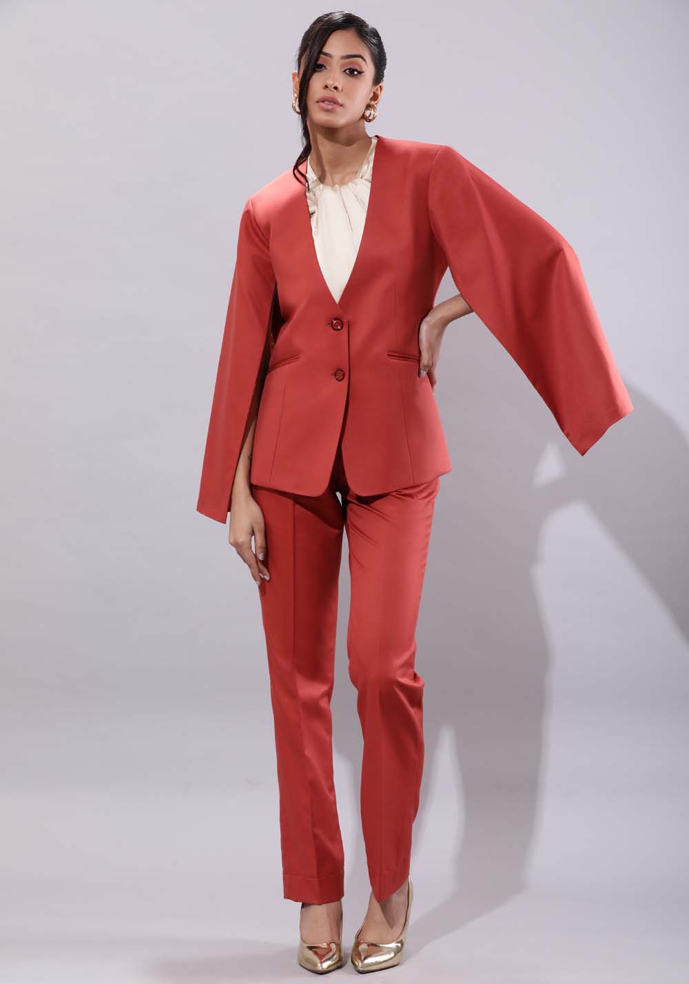 This cape business suit features a formal single-breasted blazer with cape sleeve detail. It also has functional welt pockets. The women’s work suit also comes with a pair of straight-fit trousers with front pleats, front flash pockets, and back lip pockets.